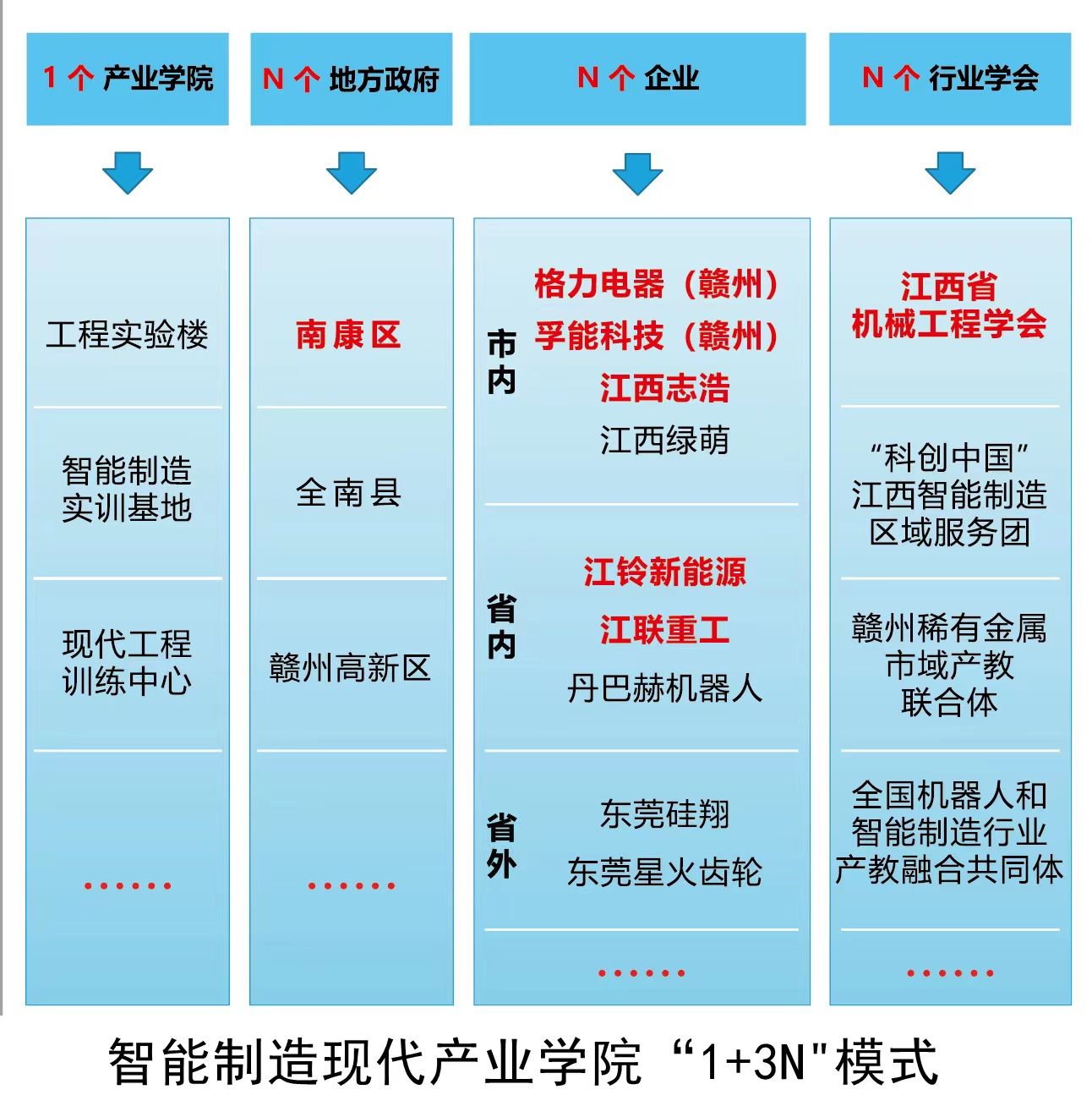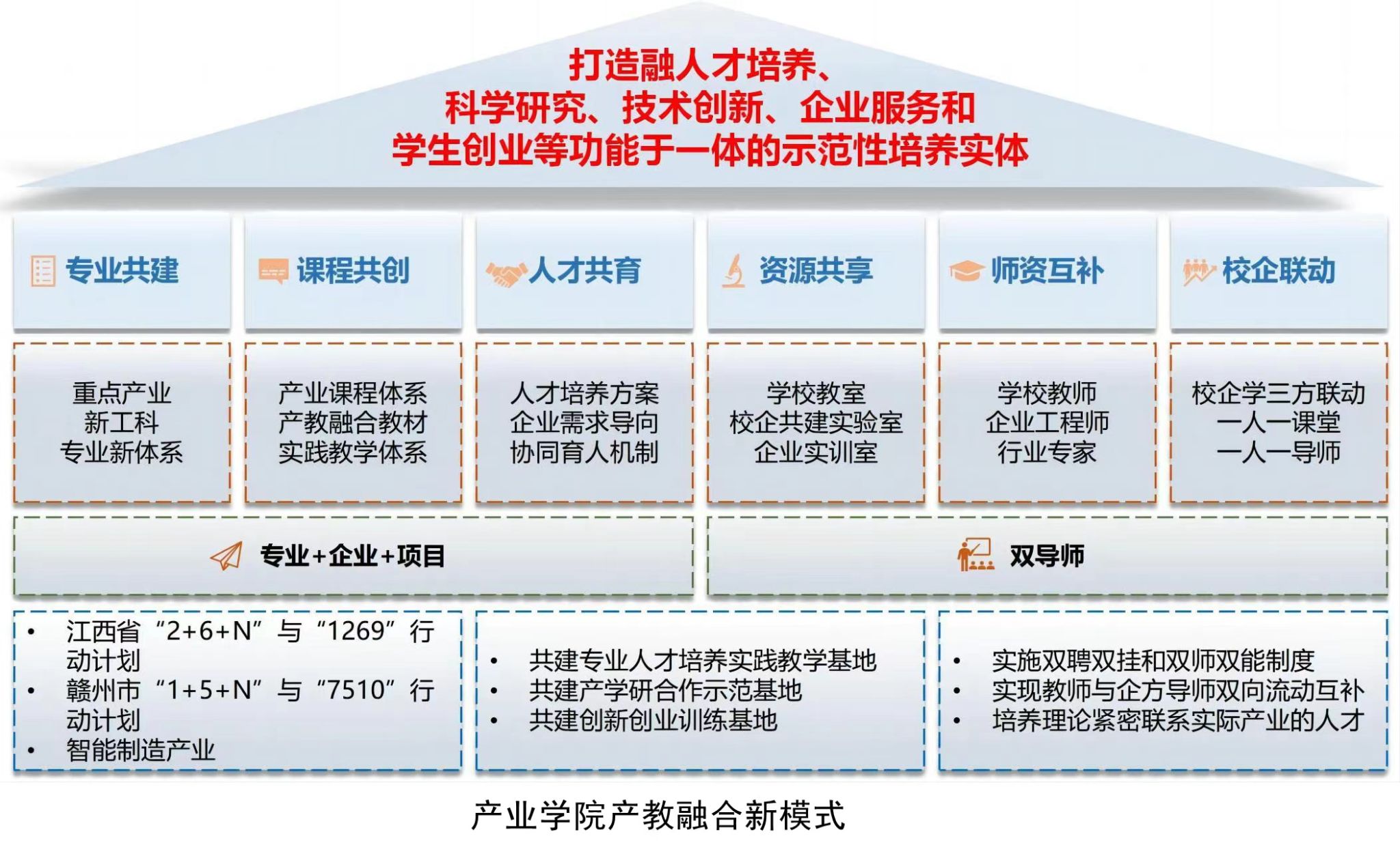 产业公司立足赣南、服务江西、面向赣粤智能制造产业,围绕装备制造、新能源、现代家具、电子信息等产业智能制造示范基地建设,积极贯彻落实《国务院办公厅关于深化产教融合的若干意见》(国办发〔2017〕95号)、教育部和工信部印发《现代产业公司建设指南(试行)》(教高厅函〔2020〕16号)、《江西省普通本科高校现代产业公司建设实施方案》(赣教高字〔2021〕23号)等文件精神,和公司以现代产业公司建设推进新工科建设、实现产教深度融合、培养高素质应用型人才的应用型本科高校建设思路,以服务新时代革命老区高质量发展示范区建设为己任,聚焦江西省“1269”与赣州市“7510”行动计划重点产业链,深化产教融合,培养高素质应用型、复合型、创新型人才,“政校企会”协同,构建“教育+培训+服务+就业+创业”的完整人才培养服务链与多方协同育人良好生态,打造融人才培养、科学研究、技术创新、企业服务和员工创业等功能于一体的示范性培养实体。