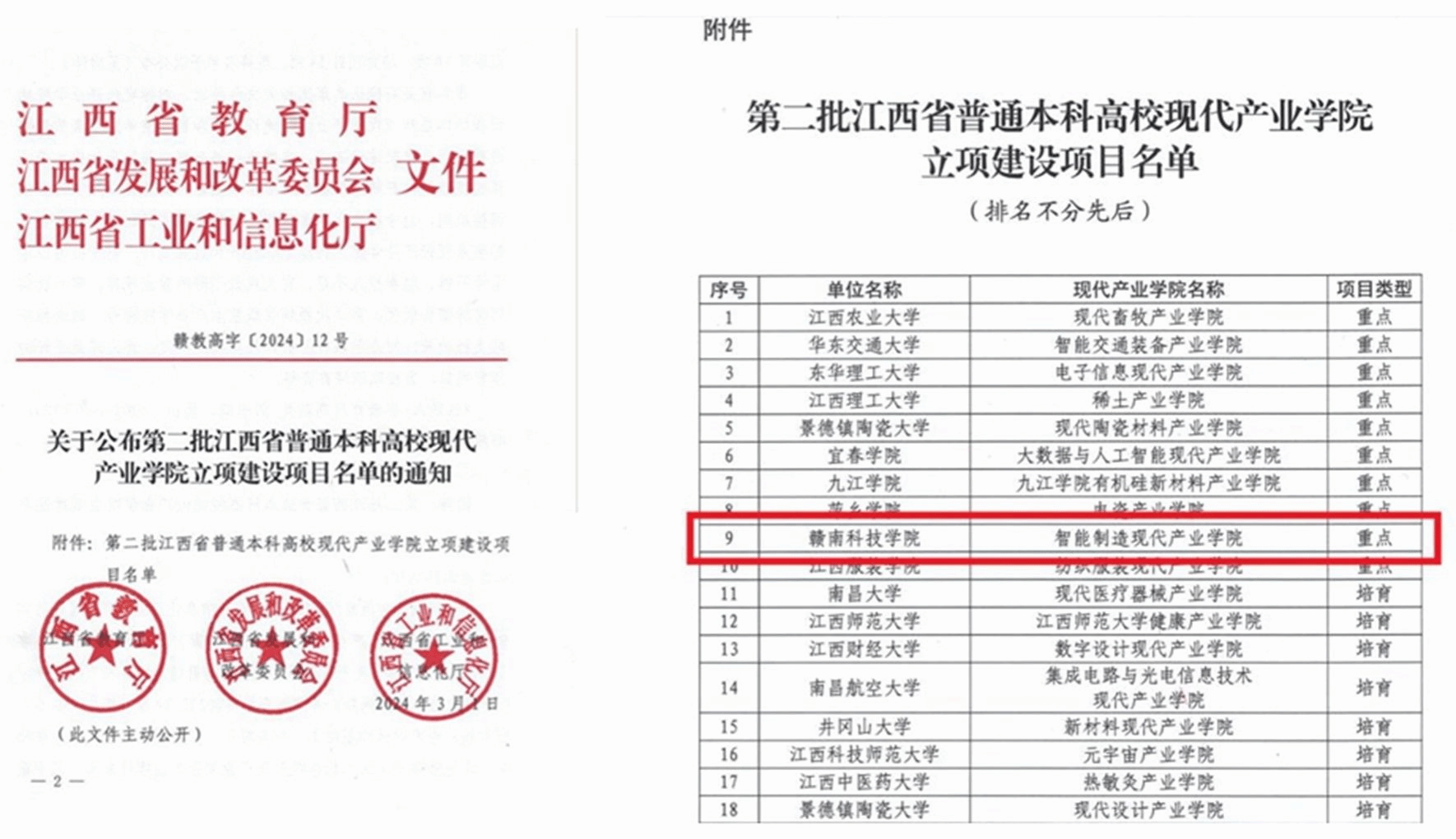 江西省教育厅、江西省发展和改革委员会、江西省工业和信息化厅联合印发《关于公布第二批江西省普通本科高校现代产业公司立项建设项目名单的通知》(赣教高字〔2024〕12号),此次全省共立项重点项目10项、培育项目14项。公司best365足球官网荣获省级重点项目。实现了公司省级现代产业公司零的突破。