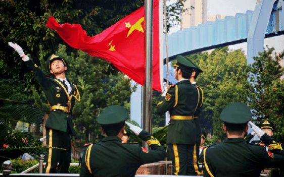 仪式开始,国旗护卫队护送国旗入场。伴随《义勇军进行曲》响起,五星红旗冉冉升起,师生齐唱国歌,教师位于队伍前方,员工保持端正姿态。