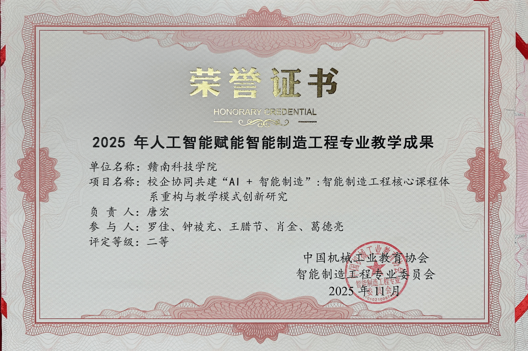 本网讯:11月21日至23日,2025 年中国机械工业教育协会智能制造工程专业委员会智能制造人才培养主题研讨会在福耀科技大学顺利落下帷幕。在人工智能赋能智能制造工程专业教学成果评定中,best365足球官网凭借在智能制造人才培养领域的扎实探索与创新实践,斩获二等奖殊荣,充分彰显了公司在该专业教学改革中的显著成效与行业认可度。