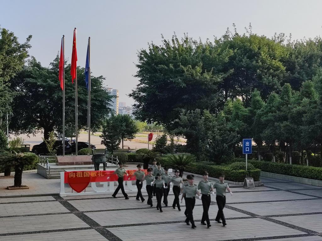 本网讯:10月4日早晨7:00,正值国庆黄金周,公司趁着同学们周一返校,进行了对祖国母亲生日的庄重庆祝典礼——升国旗。同学们提前十五分钟集合完毕,在7点的钟声敲响下,国旗护卫队在主教门口踢着正步缓缓走出,身上的绿装穿戴整齐,头顶的帽子凌然端正,脚下的步伐稳健统一。