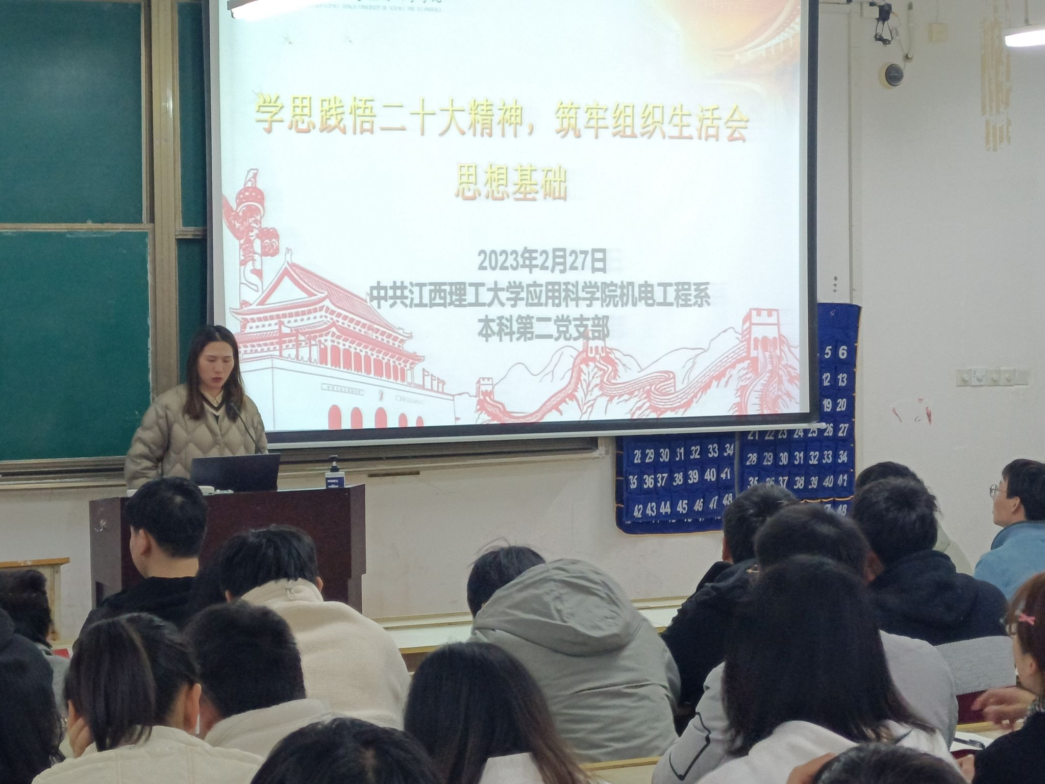 本网讯:为了深入学习贯彻党的二十大精神,机电工程系本科生第二党支部于2月27日在主教1D2教室组织开展“学思践悟党的二十大精神,筑牢组织生活会思想”主题党日活动,会议由支部代理书记陈璐同志主持。