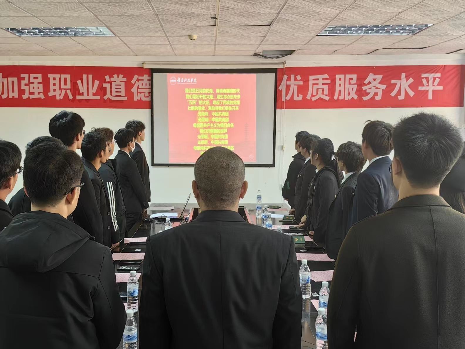 最后全体起立,奏唱团歌,以青春的名义迎接新时代,新老团员将以奋进的姿态建功新时代,让青春因担当而厚重因拼搏而精彩。期待新团员能够时刻勉励自我、坚定理想信念、练就过硬本领、投身强国伟业,始终保持艰苦奋斗的前进姿态,在实现中华民族伟大复兴的中国梦的征程上不断向前、奋勇拼搏,在矢志奋斗中谱写新时代的青春之歌。