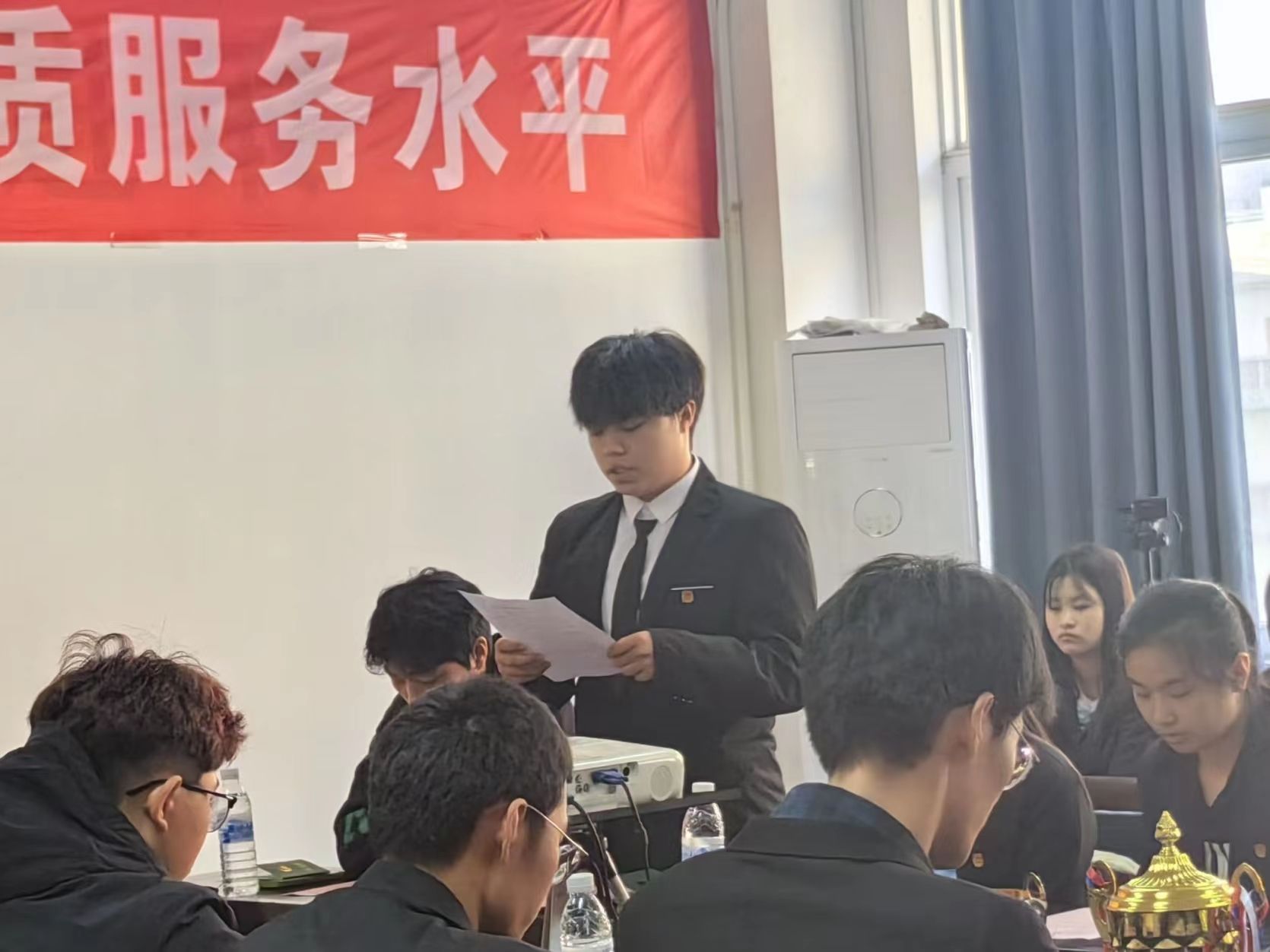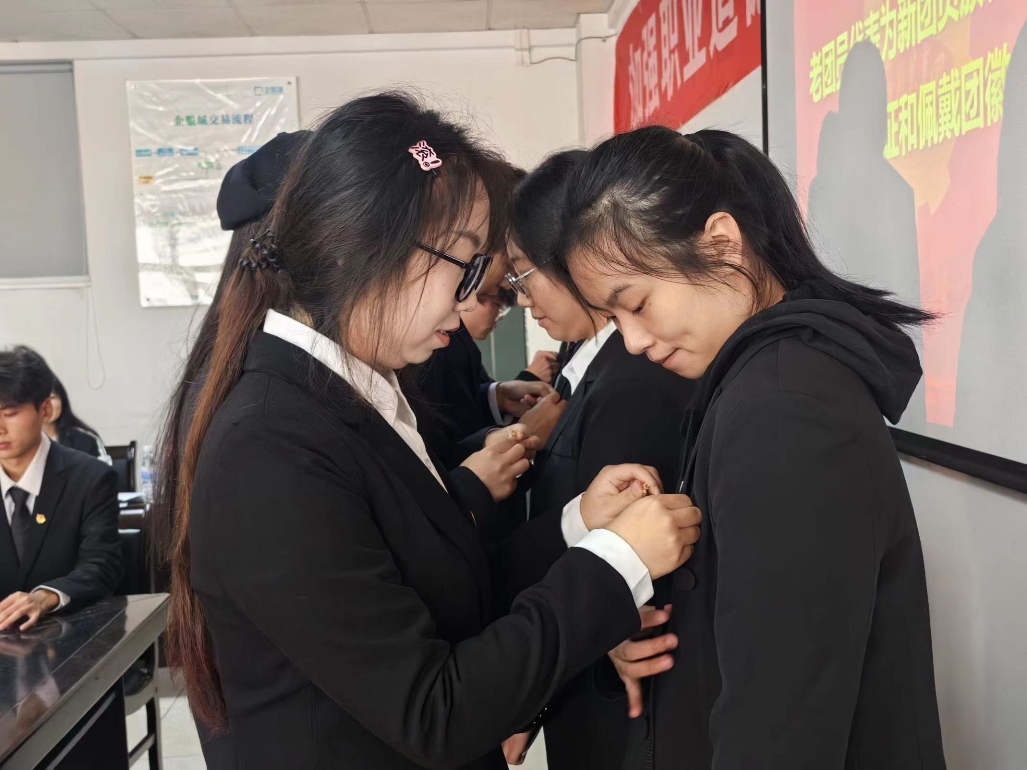 入团仪式开始,全体人员起立奏唱中华人民共和国国歌,随后由卢名亮宣布2023年新团员名单,老团员为新团员颁发团员证、佩戴团徽。