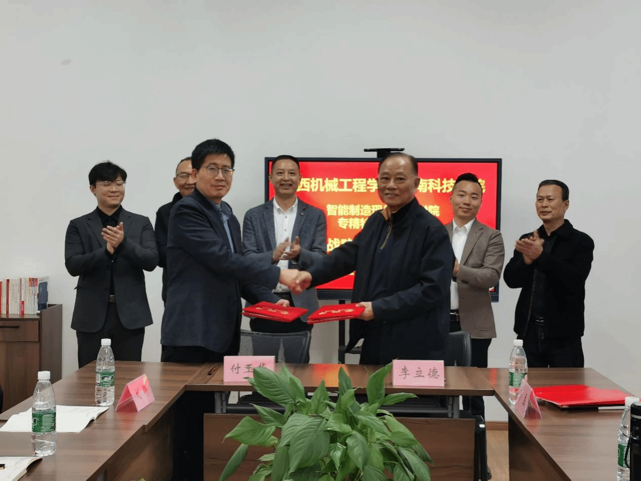 江西丹巴赫机器人股份有限公司副总经理陈源、工程师熊洪超,江联重工集团股份有限公司教授级高工徐勇敏,江铃集团新能源公司制造技术部部长王付才、智能电子开发部部长陈立伟、人力资源部部长郭彬,江西省机械工程学会龚卫江,公司机电系主任刘辉、教师钟赫等参加签约仪式。