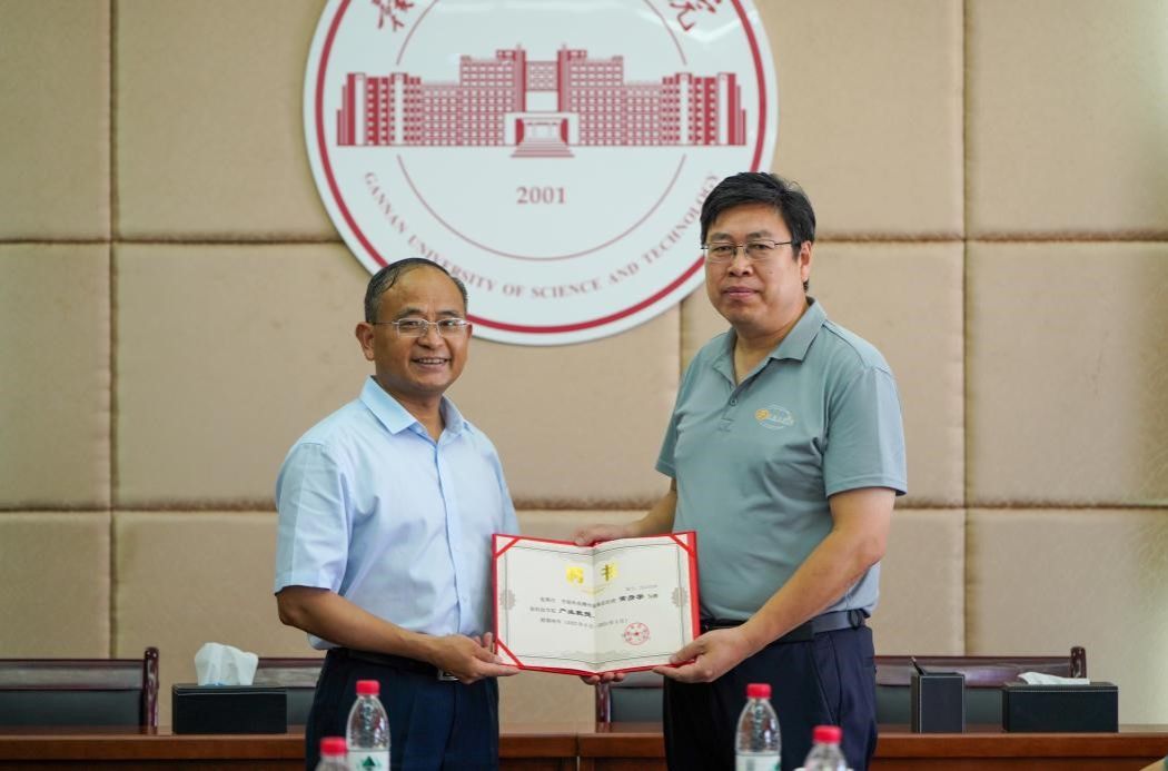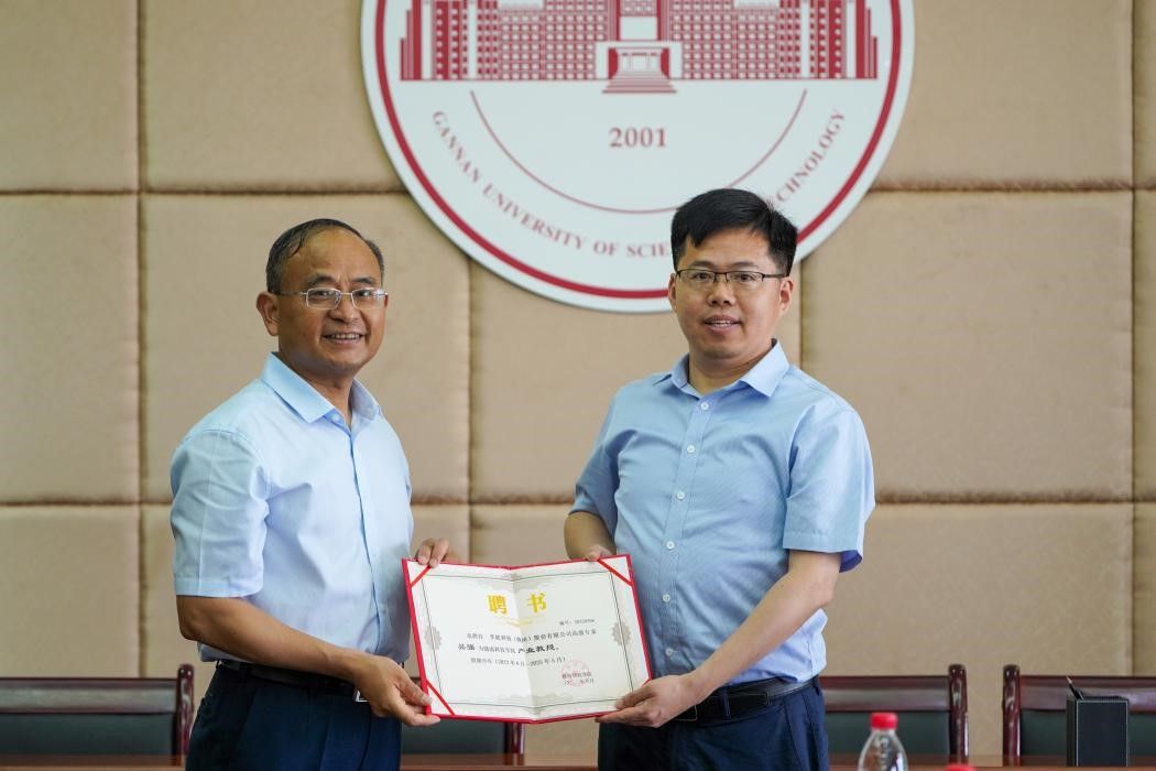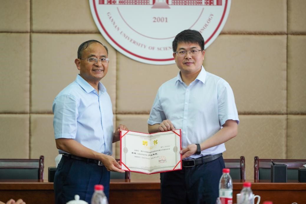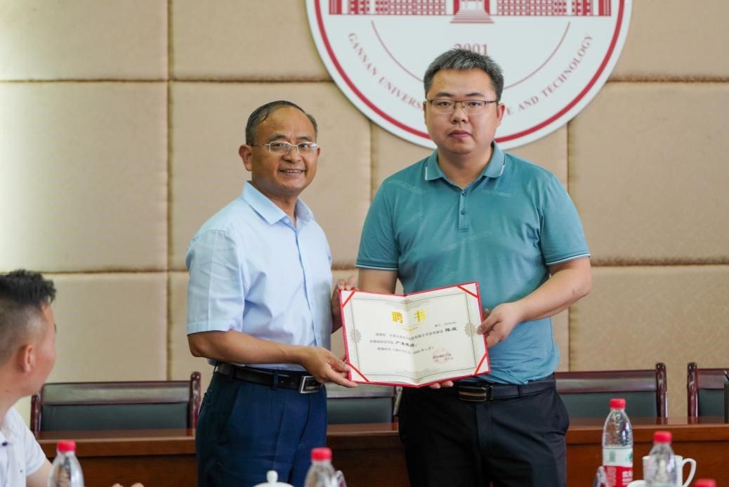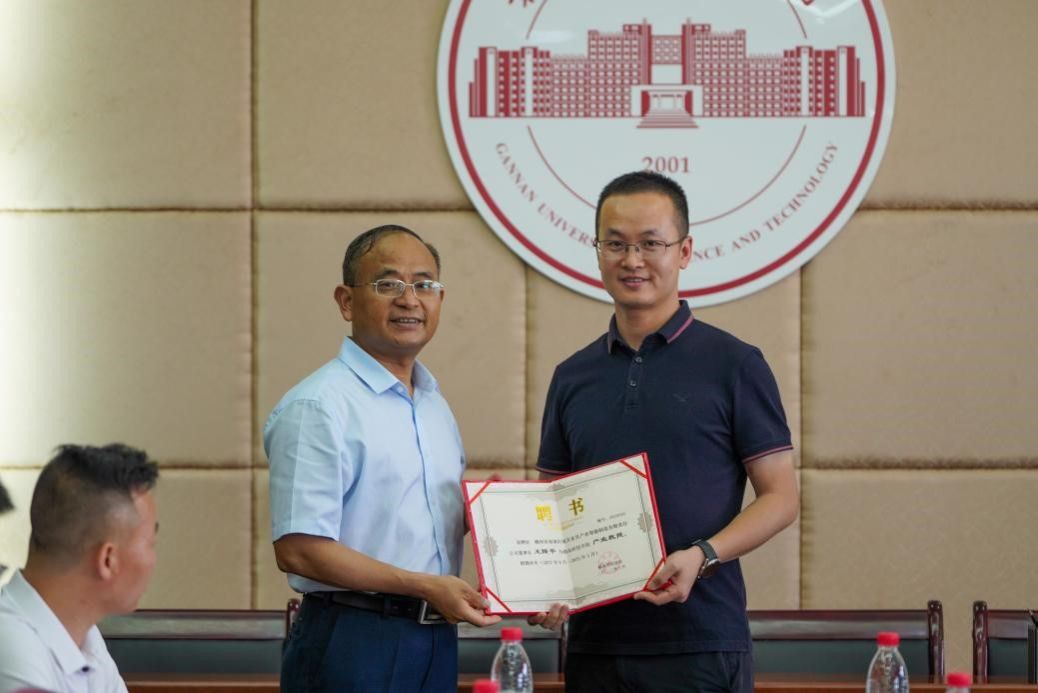 李国金为孚能科技赣州基地总经理常彦学、格力电器(赣州)有限公司总经理方掩、赣州吉锐新能源科技股份有限公司副总经理李斌、赣州市南康区城发家具产业智能制造有限责任公司董事长王隆平、江西志浩电子科技有限公司技术副总陈波、孚能科技(赣州)股份有限公司高级专家吴强、江西绿萌科技控股有限公司董事长朱壹与研发总监朱二等8位产业教授颁发聘书。