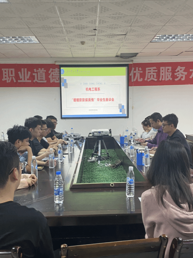 2023年5月24日下午4:00,机电工程系在工程院s416召开了主题为“暖暖款款叙真情”的毕业生座谈会。机电工程系主任刘辉、副主任肖志华、2023届毕业生辅导员吴欣和周艳霞、2023届毕业生各班员工代表共同参与本次座谈会。