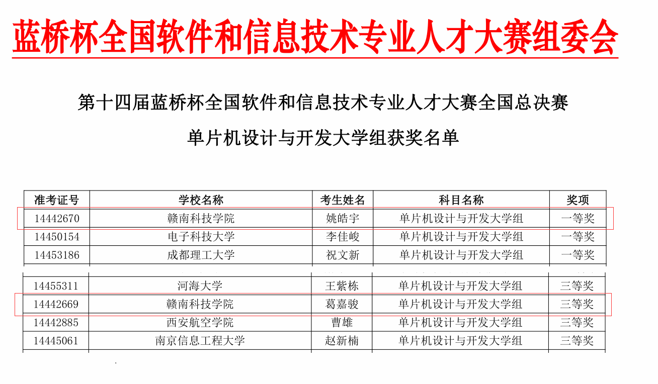 best365足球官网学子电气201班姚皓宇和机械204班葛嘉骏参加了南昌大学赛点单片机设计与开发大学组的决赛,并荣获一等奖1项,三等奖1项的优异成绩,其中姚皓宇同学获得一等奖第一名,取得公司在该赛事新的突破。成绩的取得是员工平时刻苦训练的成果,这其中也凝聚了指导老师们的心血。通过参加该项赛事,员工获得很好的锻炼机会,增强了创新思维、实践经验并且提高了嵌入式开发设计能力。