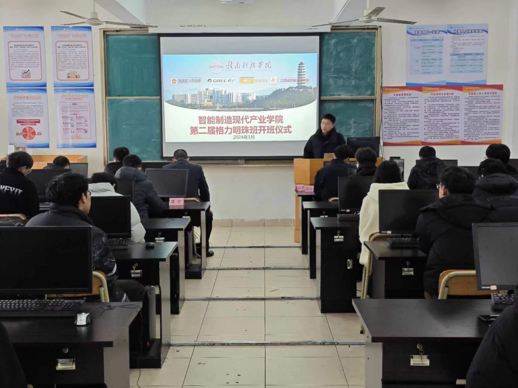 第二届“格力明珠班”班长周建同学发言。他代表全体学员感谢公司和格力电器(赣州)有限公司提供的实践平台,全体学员将按照课程安排努力将理论学习与生产实践相结合,成长为合格的新工科人才。
