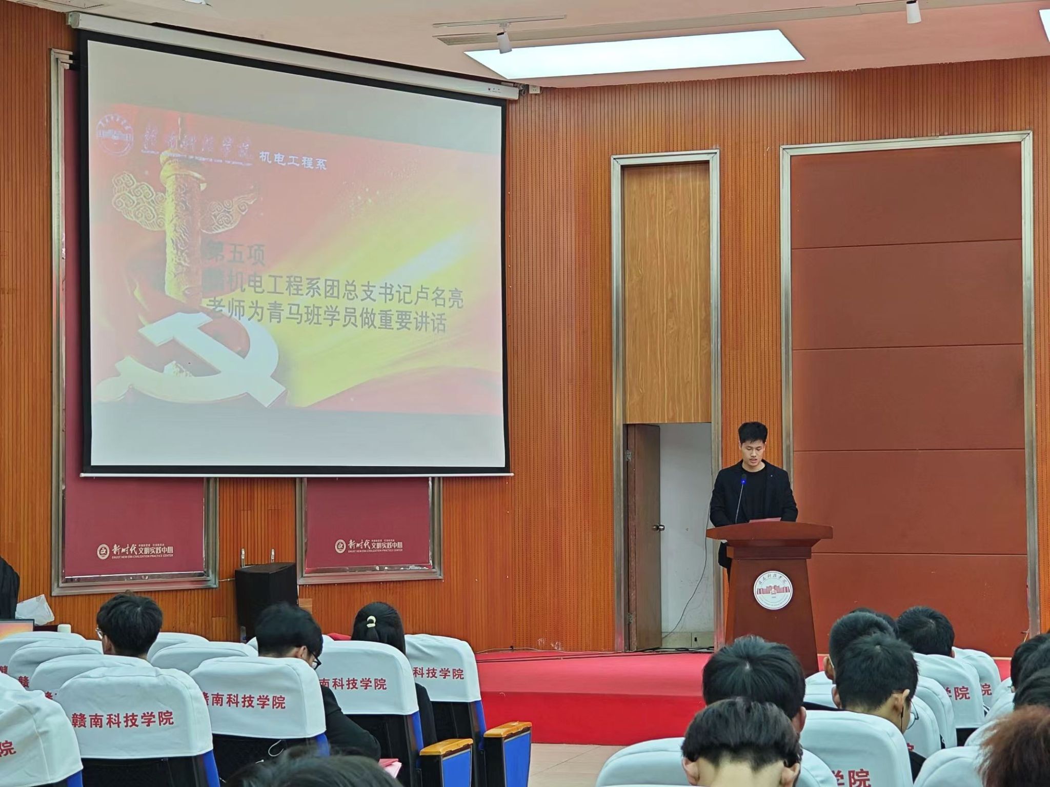 本网讯:为全面落实团省委、省学联的有关要求,深入推进“青年马克思主义者培养工程”,培养和造就一批优秀、拔尖的青年人才,机电工程系团总支、员工会举办青马培训班,同时面向全系招收学员,并于12月11日在图书馆报告厅举行十一期青马班结业典礼暨第十二期开班仪式。两期青马班全体成员参加会议,机电工程系团总支书记卢名亮和机电工程系员工会副主席蒋英明出席本次会议。